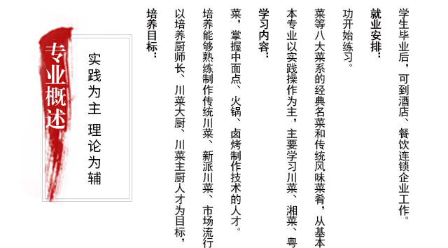 川菜导师强化训练、特殊器皿菜肴、川菜经典名菜、宴席菜单设计与制作、现代高档宴席制作、毕业综合技能会考。