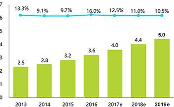 据国家统计局数据显示,2018年中国餐饮业收入约为4.4万亿元,同比增长10.8%;按10%左右的增速预估,到2019年中国餐饮业收入将超过5万亿元,市场容量广阔。