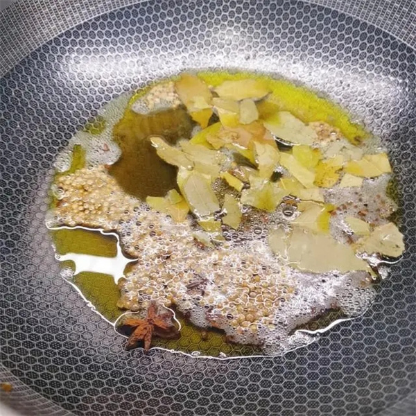 第8步、锅中留油(稍宽),小火,下入花椒、桂皮、八角炸香油。