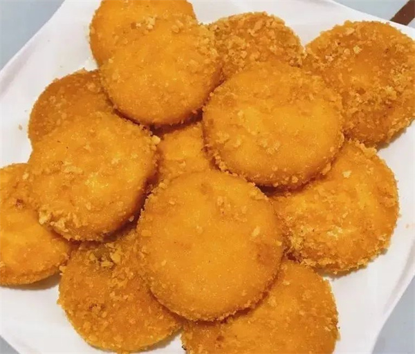 2、把南瓜面团揪成小团,揉圆后压成小饼,放在面包糠里,两面裹上面包糠。锅里倒入适量油,烧热后放入南瓜饼,小火煎至颜色金黄即可出锅,也可以用油炸。