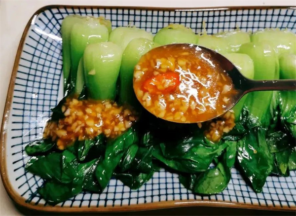 2、蒜瓣去皮切末,红尖椒切段。起锅加油烧热,放入蒜末、红辣椒爆香,加入食盐、生抽、蚝油调味,倒半碗水煮开,淋入水淀粉勾芡,酱汁浓稠后关火,浇在油菜上即可。